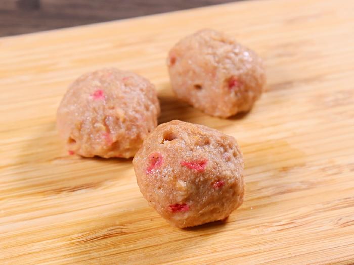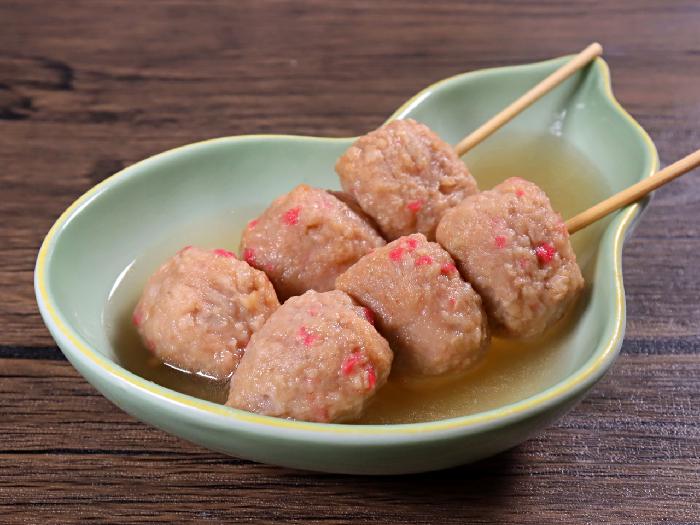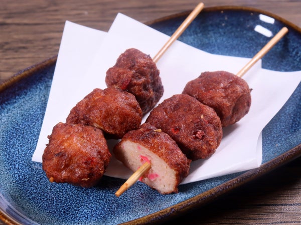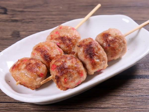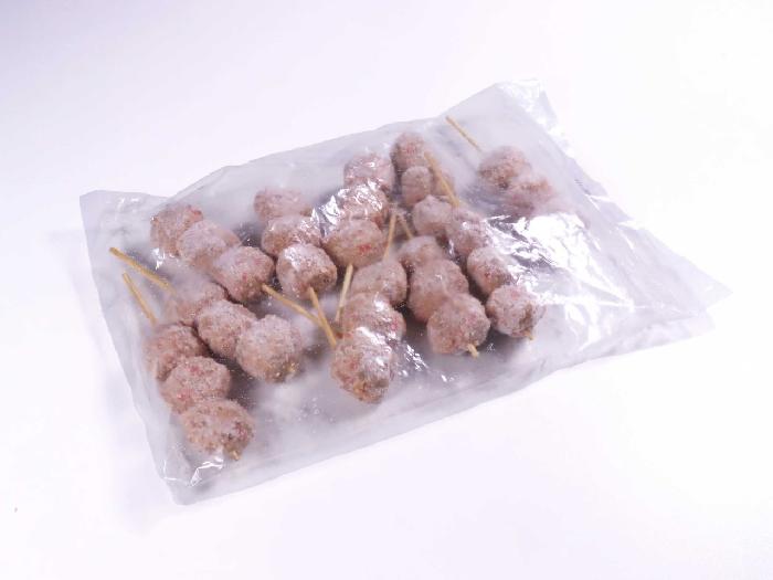 ピリッと紅生姜の風味がアクセントの柔らかめのつくね団子を串に刺しました。おつまみには最適です。揚げたり、おでん具材にも使用可能です。