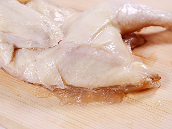 スチーム時に出た鶏のゼラチン質がついているので、適宜拭って揚げてください。