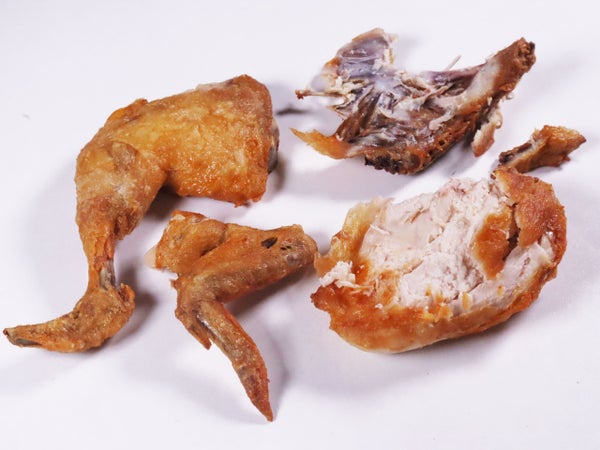 関節もはずしやすく、骨付きフライドチキンを食べなれていればそれほど難しいことはないと思います。もも・手羽を外し、あばらと背骨を肉から外したら、あとは適宜むしりとって食べるだけです。