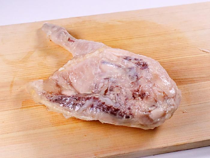 解凍後、ゼラチン部分を流し、水分を拭いて、約170℃の油で、皮目を下にして7~9分、揚げてください。