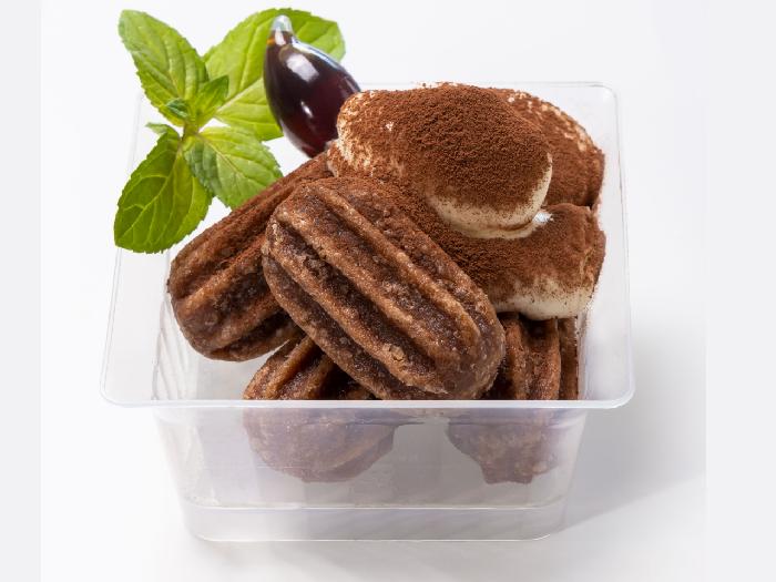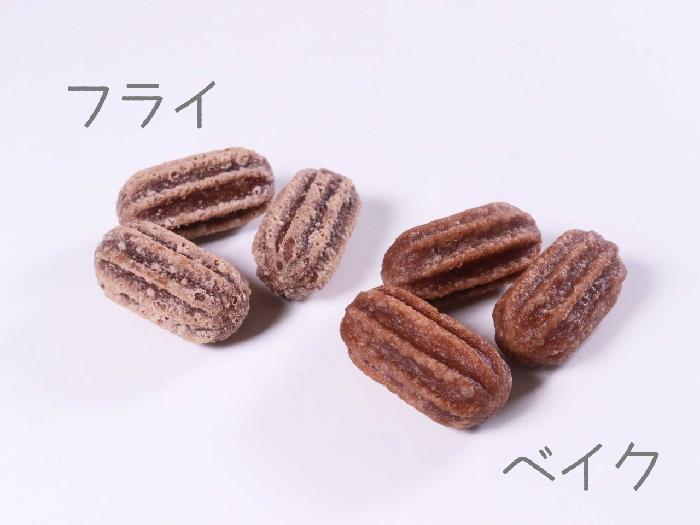 チョコ味の生地にチョコソースが入った、中からソースがとろけ出るミニチュロスです。油調のほか、オーブンやトースターでも調理可能です。