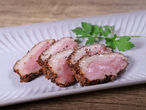 燻製時に「リンゴの木」チップを使用し、柔らかく、ほのかな甘い香りがとても上品な合鴨ハム。黒胡椒を散りばめたピリッと大人の味わいです。オードブル・サラダ・ピザ・パスタのトッピングにアレンジが広がります。