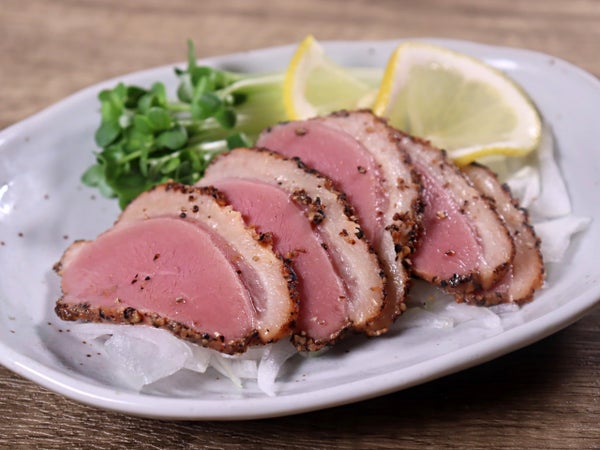 あい鴨に粗挽きの黒胡椒をまぶし、リンゴチップで香り豊かにスモークしたパストラミです。4mmスライス済みなので解凍後、すぐにお使いいただけます。