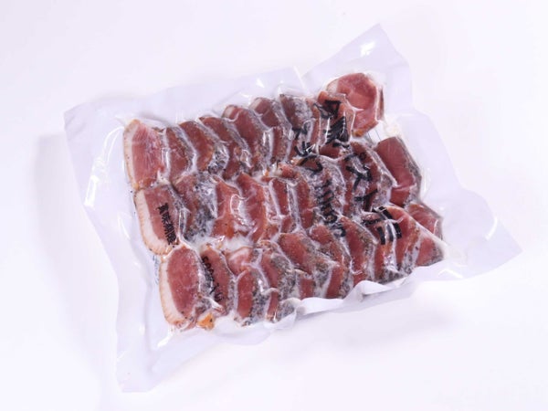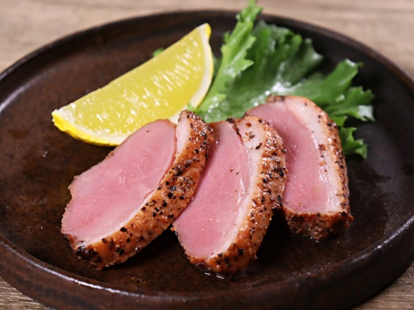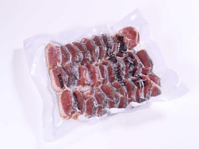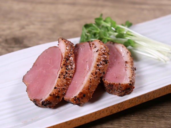 あい鴨に粗挽きの黒胡椒をまぶし、リンゴチップで香り豊かにスモークしたパストラミです。10mmスライス済みなので、ねぎとオイルで食べ応えのあるおつまみなどに解凍後、すぐにお使いいただけます。