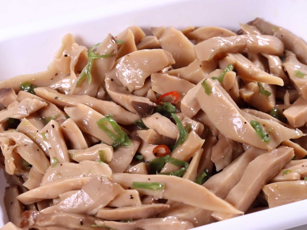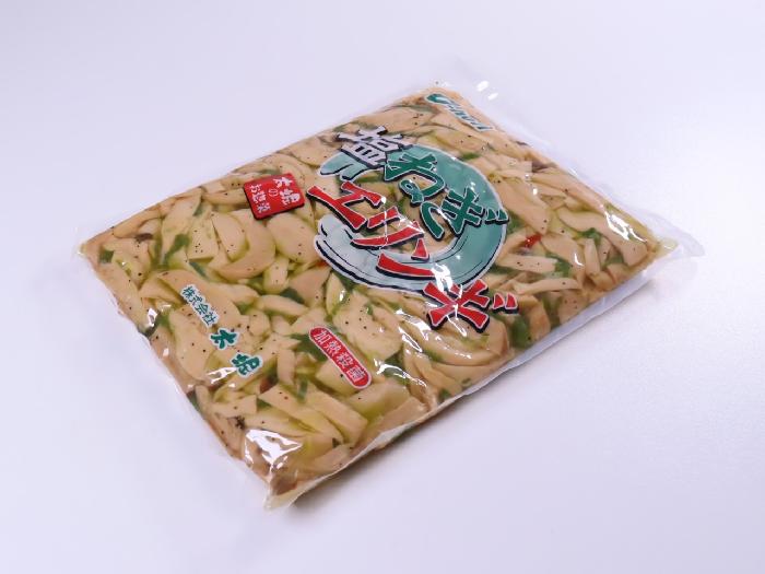 しなやかで、やわらかながら歯触りのいいエリンギを、にんにくねぎ塩だれをベースに味付け。おつまみになる惣菜です。