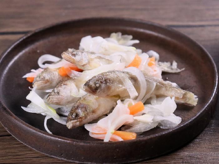揚げた後、甘酢や野菜で南蛮漬けに。