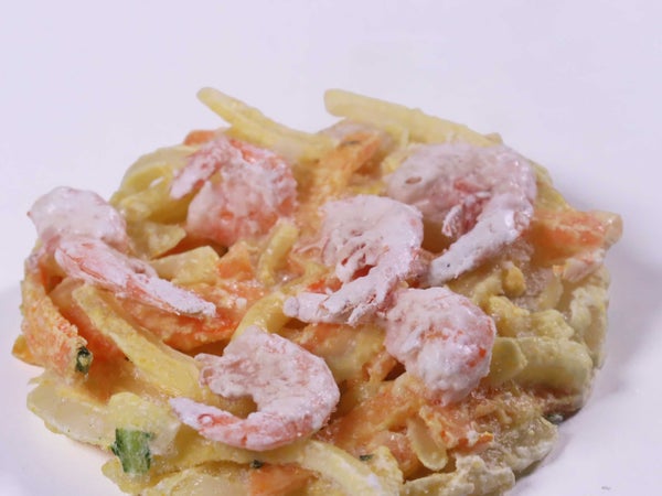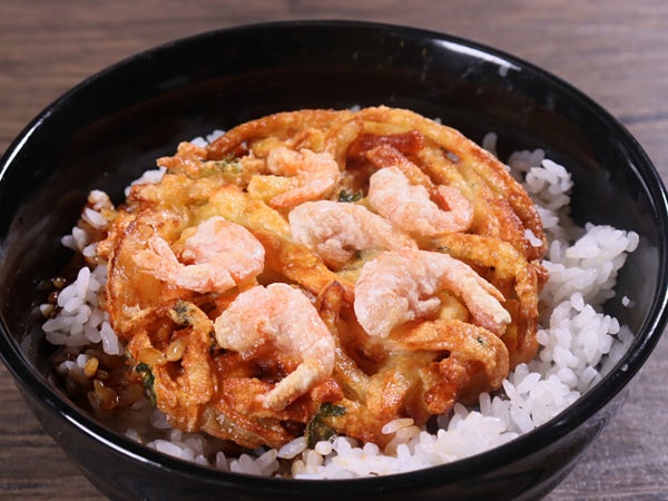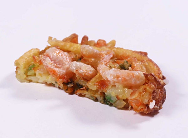 玉ねぎ・人参・じゃがいも・春菊の野菜を合わせて、上にうま味のある殻付きえびをトッピングしました。蒸しタイプのかき揚げのため、玉ねぎの甘みが存分に感じられる仕立てです。そばやうどんのトッピングにおすすめです。