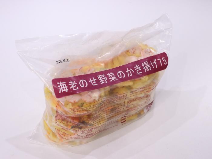 野菜(たまねぎ、にんじん、じゃがいも、春菊)、えび、衣(小麦粉、でん粉、コーンフラワー、全卵、大豆粉、食塩)、大豆油/乳化剤、膨脹剤、増粘剤(グァーガム)、着色料(β‐カロテン、ウコン)、(一部にえび・卵・小麦・大豆を含む)