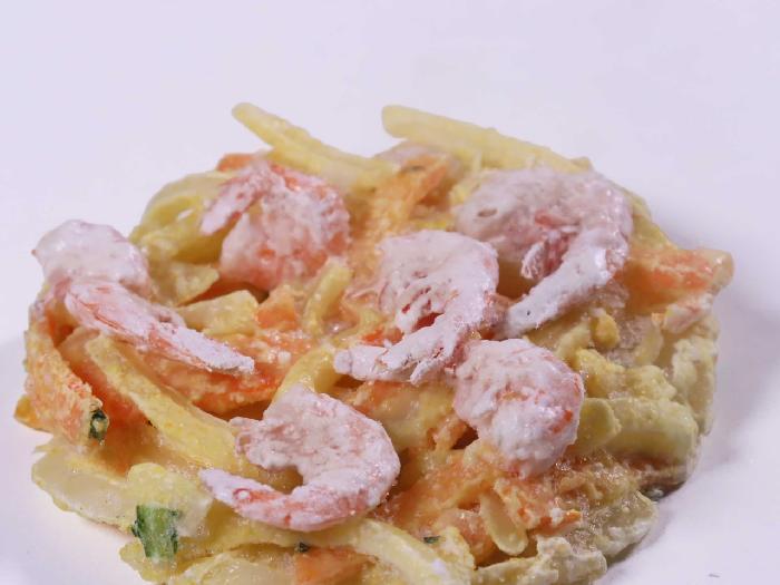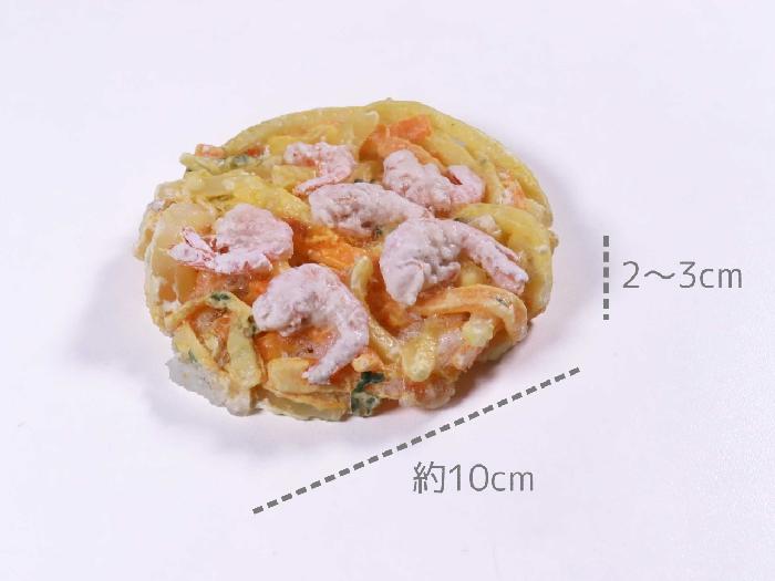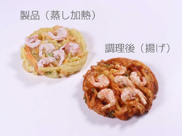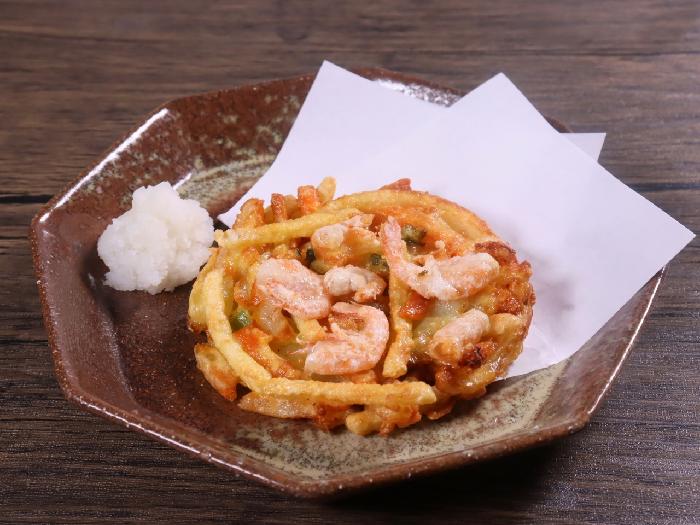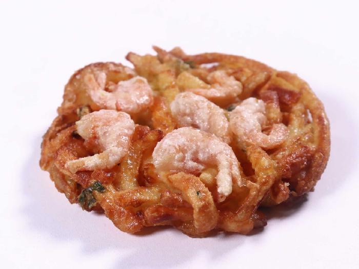 玉ねぎ・人参・じゃがいも・春菊の野菜を合わせて、上にうま味のある殻付きえびをトッピングしました。蒸しタイプのかき揚げのため、玉ねぎの甘みが存分に感じられる仕立てです。そばやうどんのトッピングにおすすめです。
