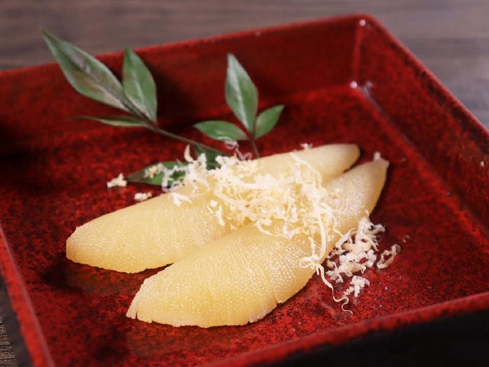 パリパリとした歯触りの良い数の子を皮をむいて味付けしました。1本もので見栄えも良い中型サイズの数の子です。おせち・前菜などにお使いください。