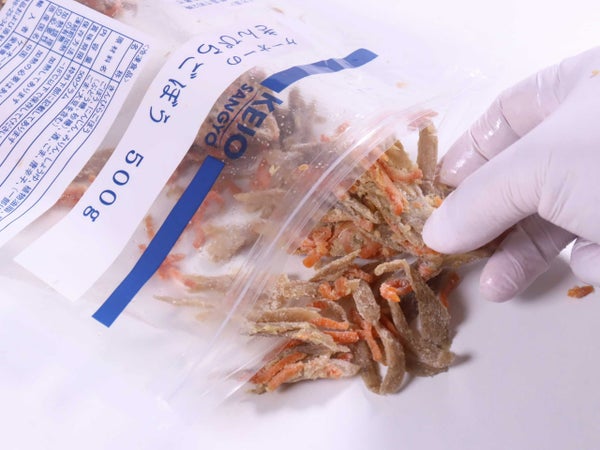 ごぼうにしっかり煮汁を吸わせているので、冷凍状態でも手でほぐして取り出せるくらいです。チャック付き袋入り。