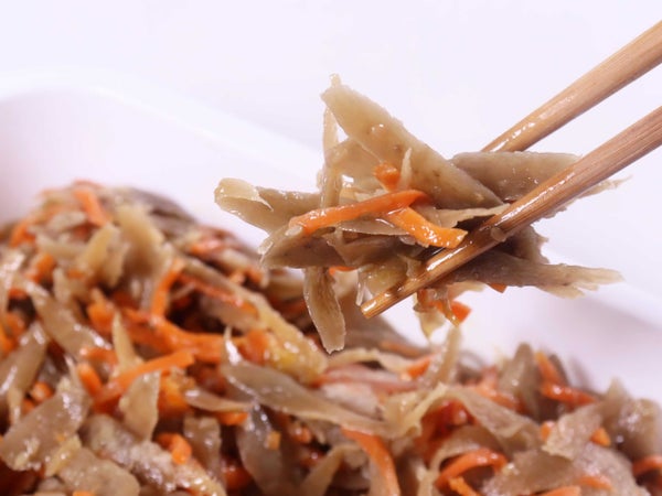 ささがきごぼう・にんじんを煮汁が無くなるまで炒めた、手作り感のある金平ごぼうです。ごま油の風味を効かせ、ややしっかりめに味付けした「居酒屋仕様」に仕上げました。自然解凍で提供できます。完全なバラ凍結ではありませんが、手でほぐして必要な分だけ取り出せる凍結状態です。