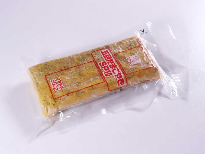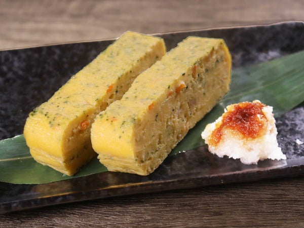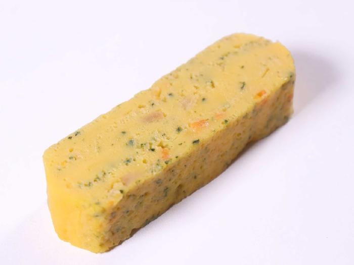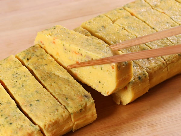 にんじん・たまねぎ・ほうれんそう・豚肉・干ししいたけ入りの、彩りの良い五目厚焼きたまごです。カット済なので弁当などの大量調理におすすめです。
