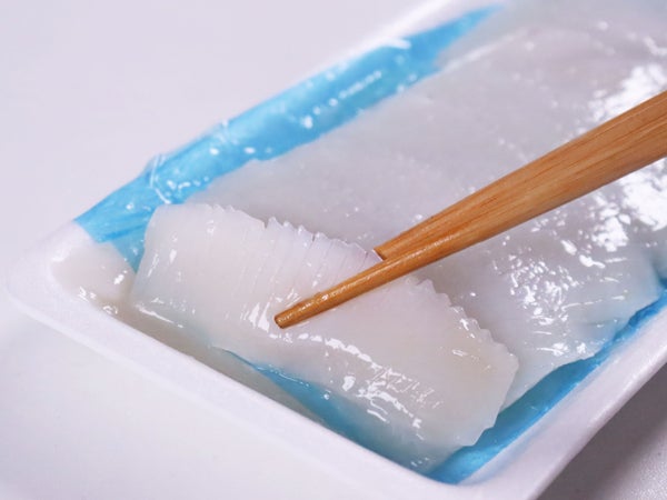 生食用のアメリカオオアカイカ(ペルーイカ)を8gにスライスしました。食べやすくスリットを入れてあります。寿司・刺身におすすめです。