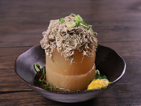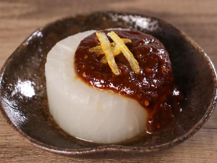 おでんで映える大ぶりサイズの輪切りの蒸し大根です。播種から加工まで一元管理された大根を使い、維管束を除去してブランチングすることで、自然の甘みと旨みをそのままに冷凍変性のない冷凍大根を実現しました。形も揃っていて、短時間でおいしくきれいに仕上がります。pH調整や添加物を一切使用していません。事前解凍せずに冷凍のまま直接一気に加熱調理すること、十分加熱したらいったん常温まで冷ますのがおすすめです。