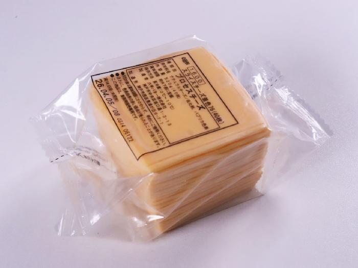 チェダーチーズを使用したスライスチーズです。コールドサンド・ホットサンドのどちらにも使用できます。剥がしやすくするために交互にずらして重ねてあります。