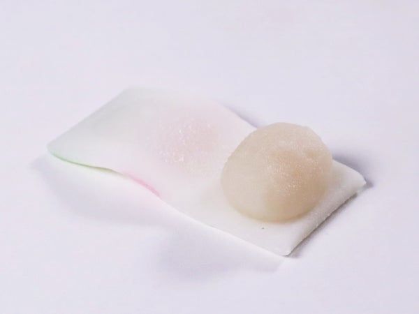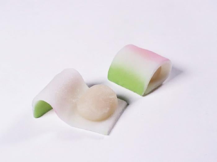 伝統的な上生菓子「落とし文」を春を感じる三色で表現しました。しっとりした白餡を、もっちり生地で包んだ、上品な甘さの餅菓子です。