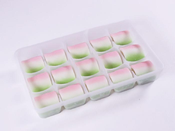 冬の終わりと春の訪れを表した和の三色(桜・新緑・雪解け)が美しい小さいお菓子です。