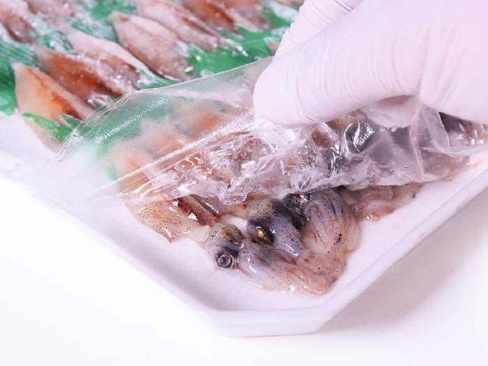 VSPと呼ばれる柔軟性のある特殊フィルムが、ホタルイカの表面に吸いつくように形に添ってコーティングしています。