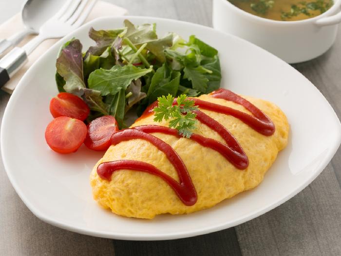 ふんわりとしたたまごシートと、ふっくらチキンライス。味付けは強くないので、ケチャップやデミソースなどがあったほうがいいですね。