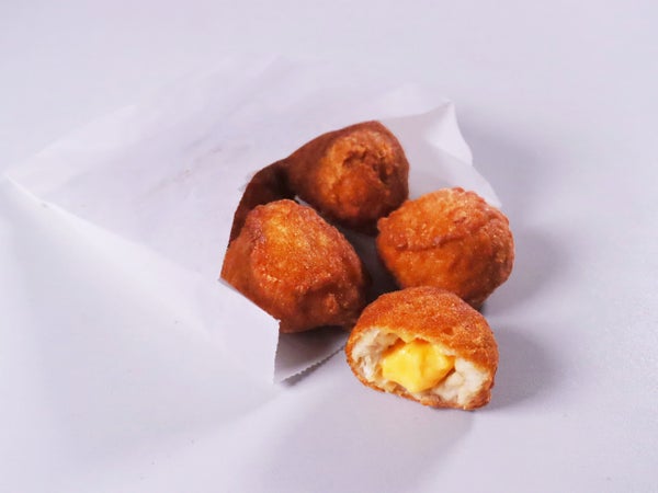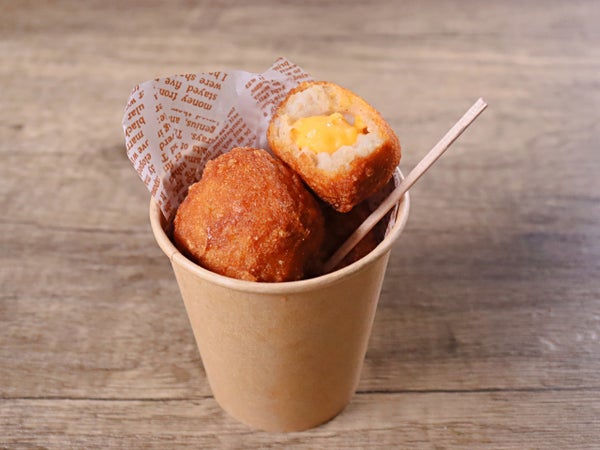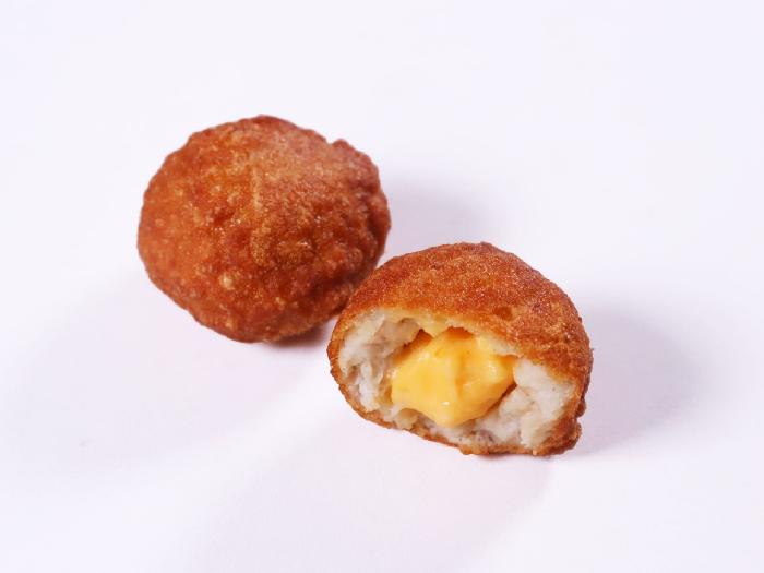 ボール状の国産チキンナゲットの中に、チーズを仕込みました。直径は3~4cmほど。