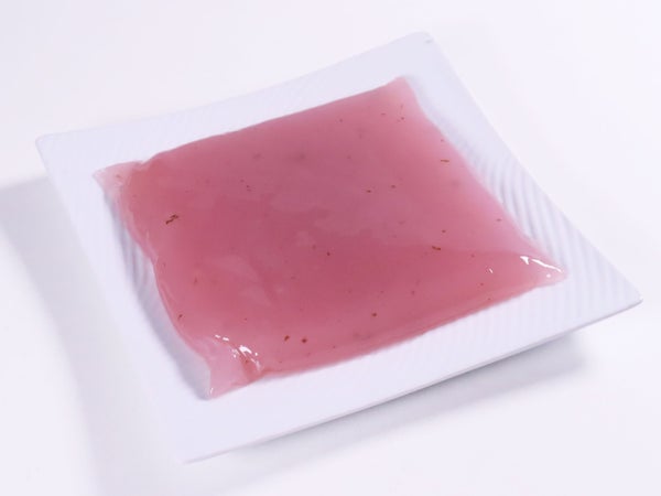 もちやわプルンの食感がたまらない、刻んだ桜葉がアクセントの、桜の香りいっぱいのわらび餅です。切れ目が無いので、お好みでスプーンや包丁でカットし、取り分けができます。