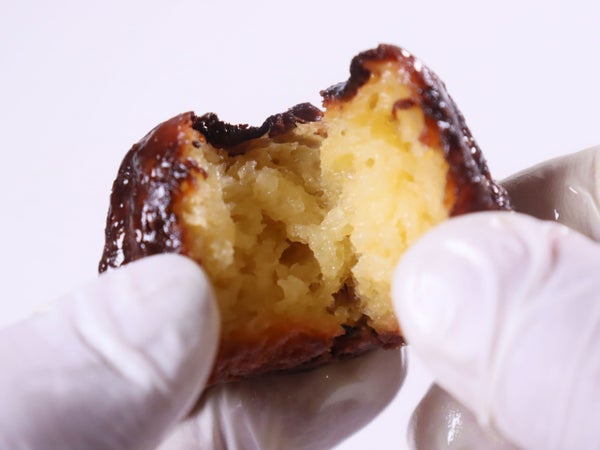 直径は底面で約3cm、高さ約3cm。固めに焼きあがった表面と、しっとりもっちりの内面が対比的です。