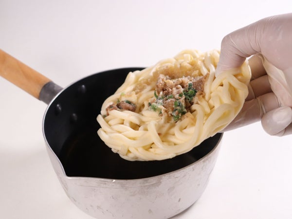 鍋に水250cc入れて沸騰させ、冷凍麺とつゆを入れ、約3分30秒加熱してください。