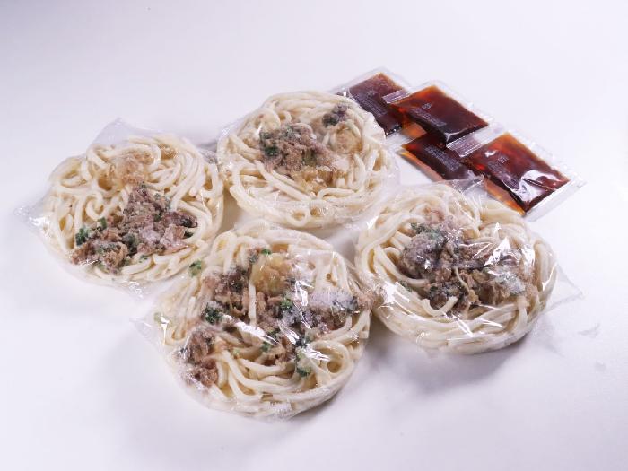 甘辛の牛肉・ソテーしたたまねぎ・ネギが入った讃岐うどんのできあがり。