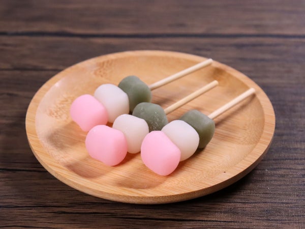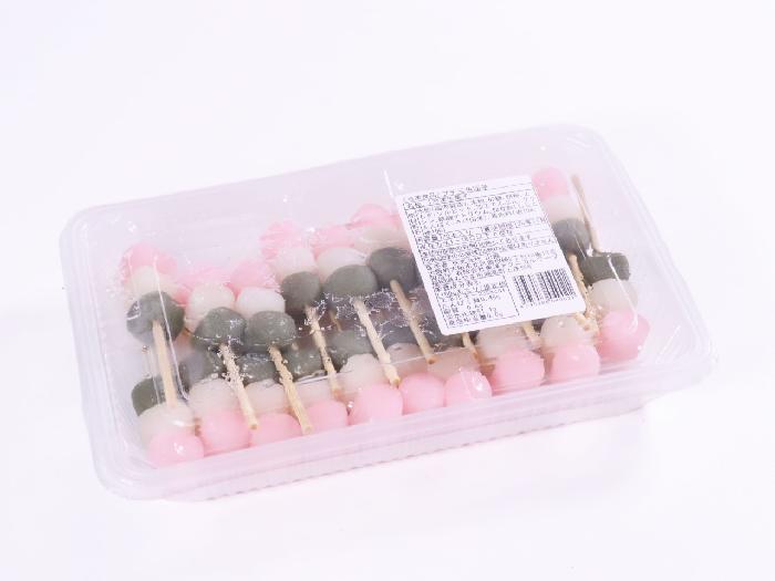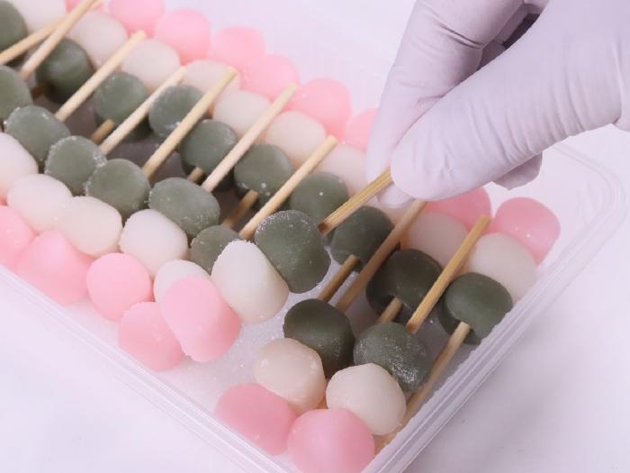 米粉で作ったピンク・白・緑のお餅を串に刺した、小さくてかわいい3色団子串です。