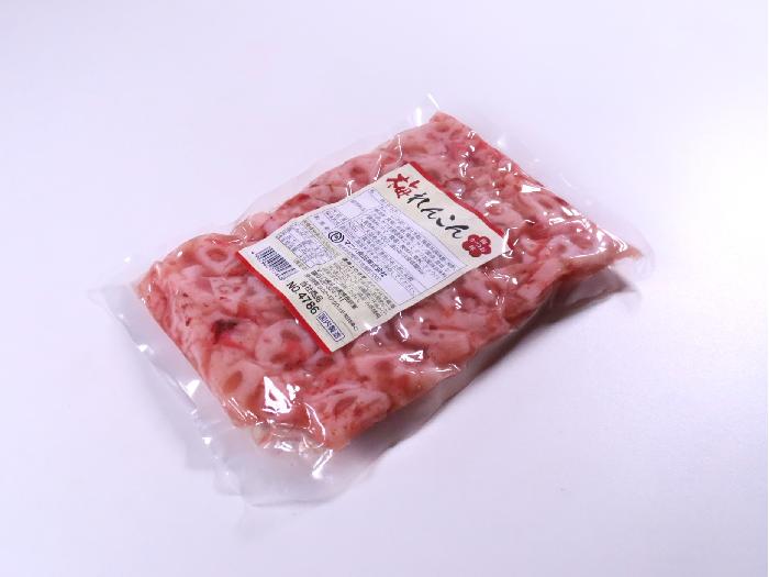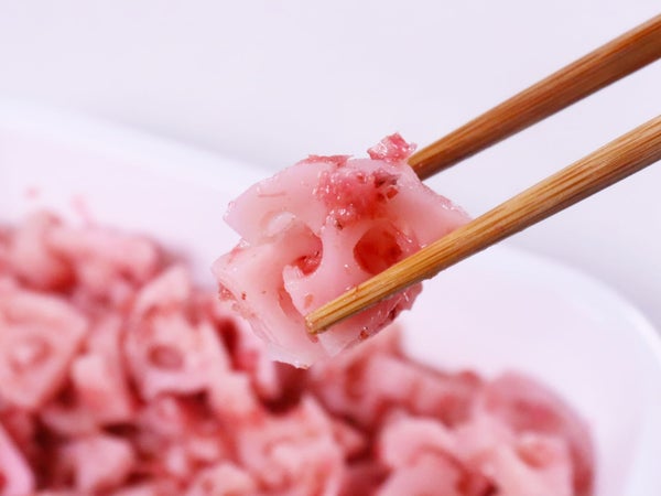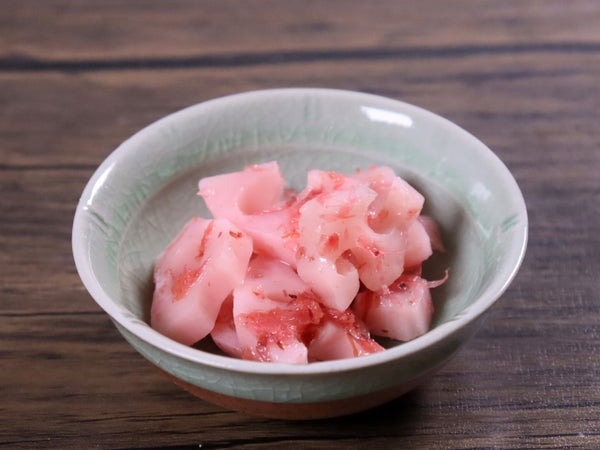 シャキシャキとした食感の良いれんこんをかつお節の効いた、梅風調味料で和えました。きれいなピンク色で春の惣菜として最適な一品です。