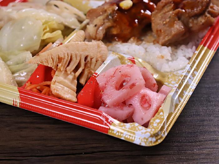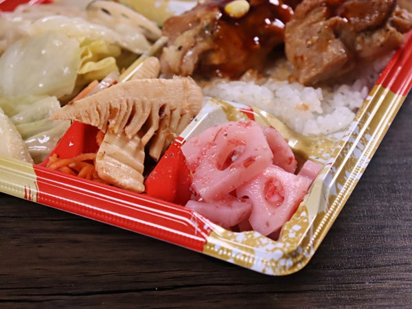 れんこん(中国)、還元水飴、梅風味調味酢(梅酢、醸造酢、食塩)、砂糖、梅肉、アミノ酸液、食塩、かつお節、かつお節調味エキス、かつお風味調味料/調味料(アミノ酸等)、酸味料、香料、ミョウバン、着色料(赤106)、漂白剤(次亜硫酸Na)、(一部に大豆を含む)