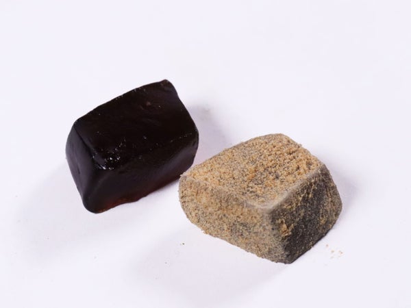 おおむね3cm角のカット。コクのある黒糖風味のわらび餅に香り良いきな粉をまぶしました。