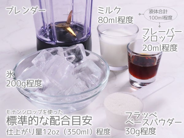シロップを使って作る基本の例です。用意するものは、フラッペベースパウダー約30g・氷約200g・ミルク約80ml・シロップ類約20mlです。