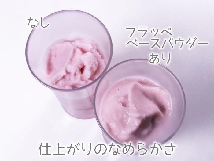 仕上がりの時点で、フラッペベースパウダーを入れたものはとてもなめらかなのに対して、入れていないものは氷粒と液体が一体化しきれていません。