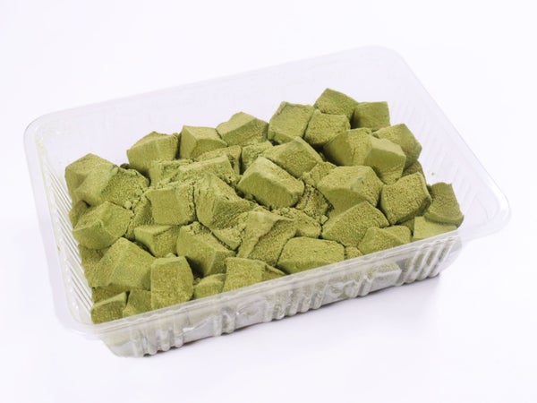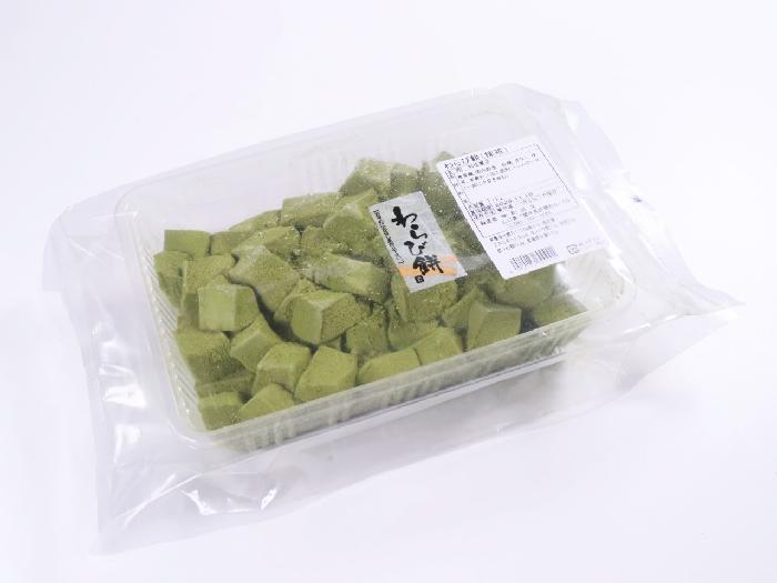 おおむね3cm角のカット。透き通るわらび餅に抹茶香るきな粉をまぶしました。