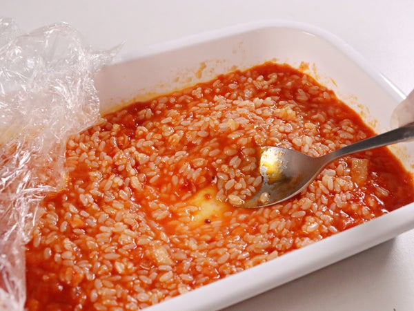 【レンジ調理の場合】①凍ったままのリゾット米とお好みのソース1カップを入れ、ふんわりとラップをかけてレンジにかけます(600Wなら約2分30秒)。