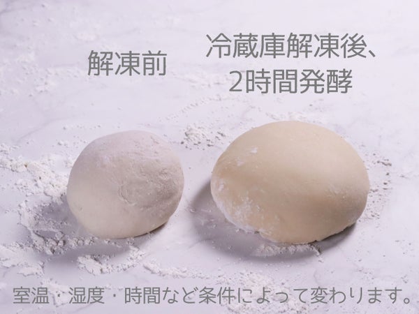 冷蔵庫内解凍で約15時間解凍後、成形し250℃のオーブンで約5~6分間焼いてください。