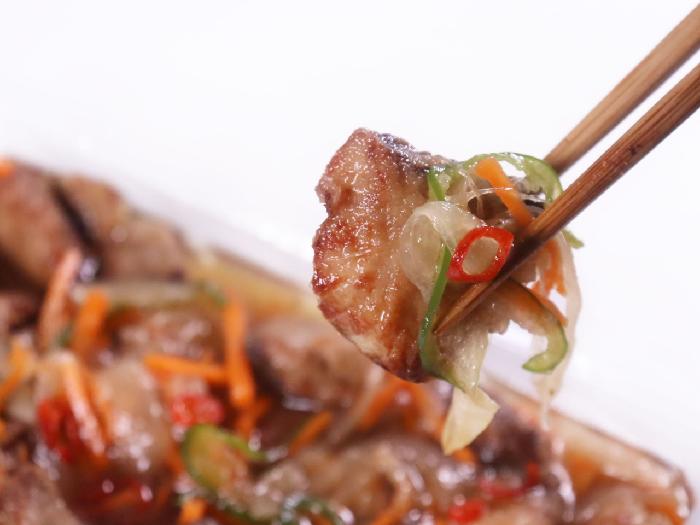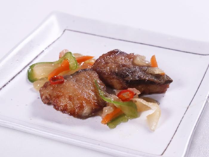長崎県産のぶりを使用し、玉ねぎ・にんじん・ピーマンとともにさっぱりとした南蛮漬けに仕上げました。