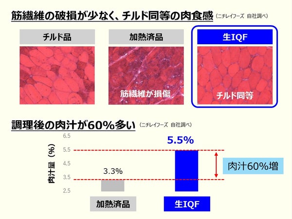「生IQF」なら、お店で揚げる時が初めての加熱調理。肉感はチルド品に負けず劣らず、肉汁も加熱済み冷凍唐揚げに比べて60%もジューシーです。(ニチレイフーズ調べ)