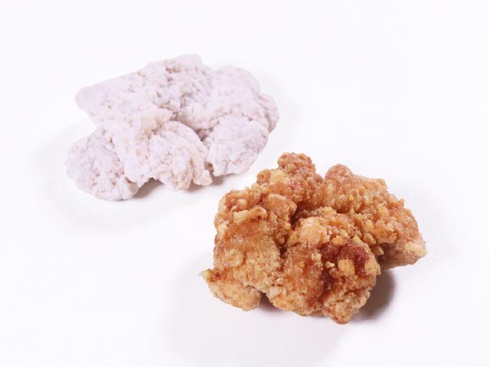 同じような見た目で、同じように揚げるだけですが、一般的な冷凍唐揚げは「加熱済みのプリフライ品」、この商品は「中は生のままの未加熱品」です。