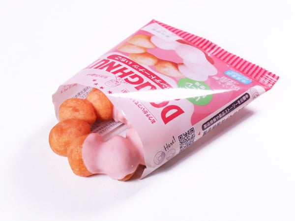 おなじみの生地はもっちり食感。生地もピンクのいちご味です。
