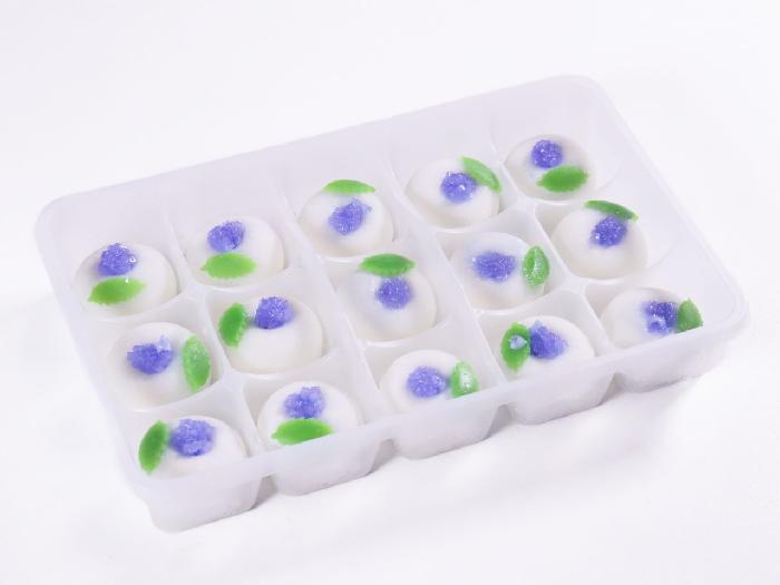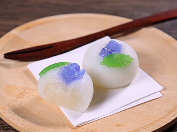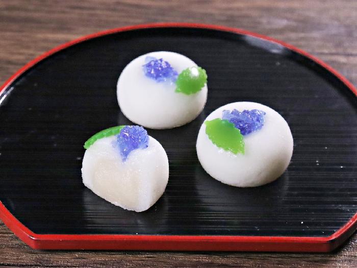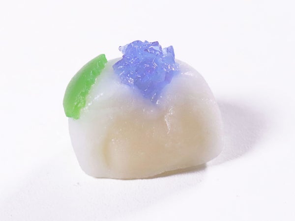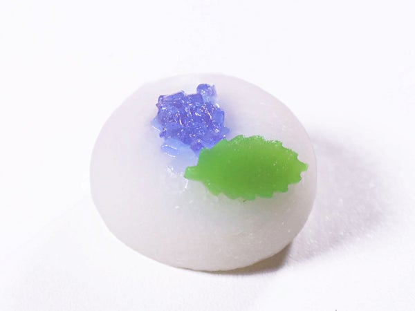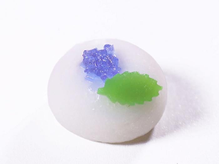白あんを餅生地で包み、寒天であじさいの花を表現した、上品な甘さの餅菓子です。