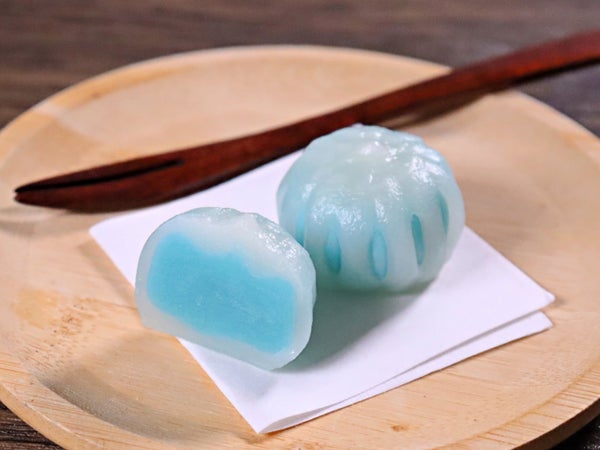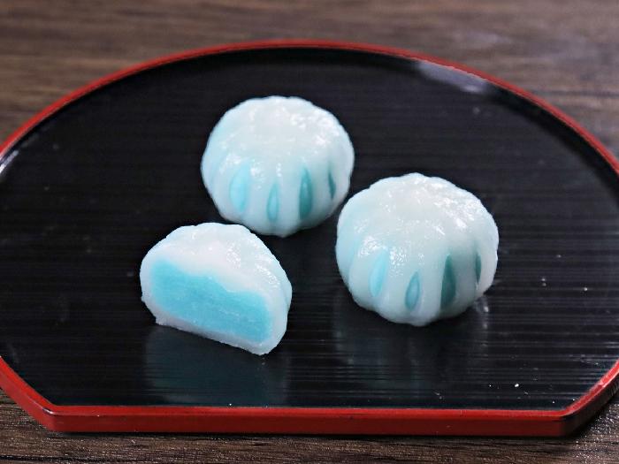 ラムネ風味の青い餡に、餅生地を糸のように模った小菓子です。