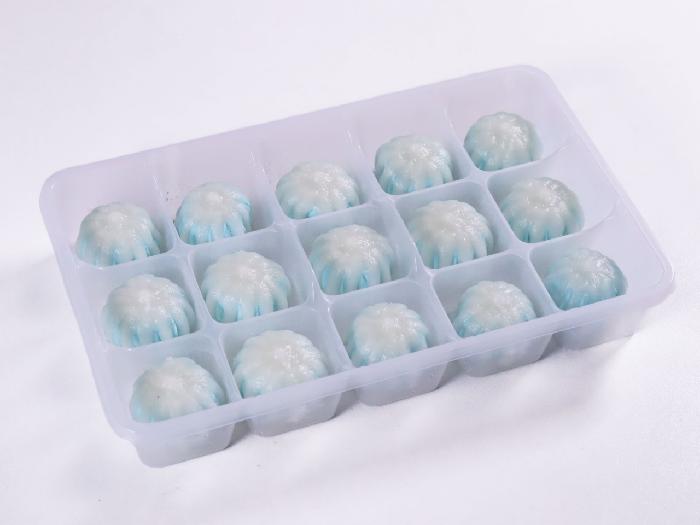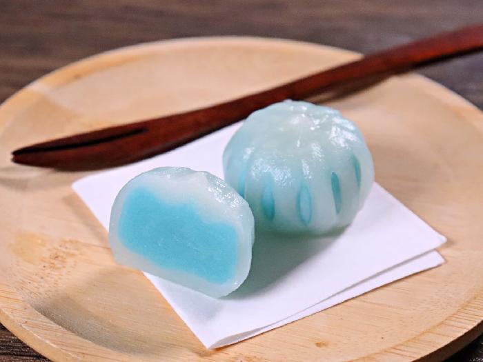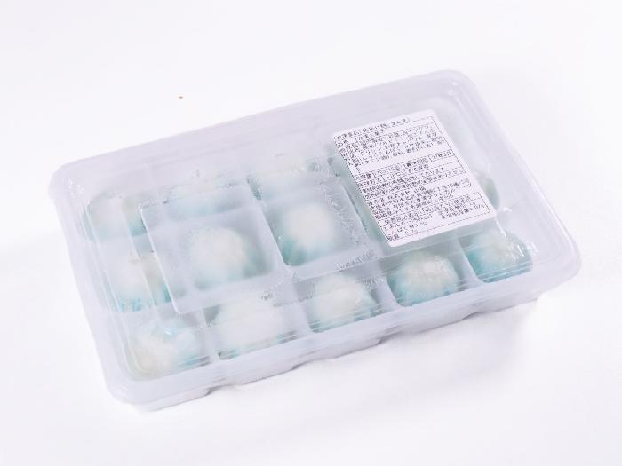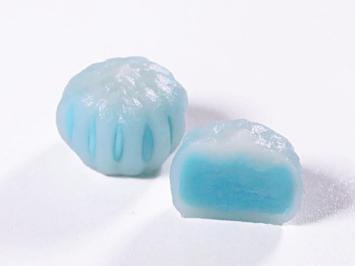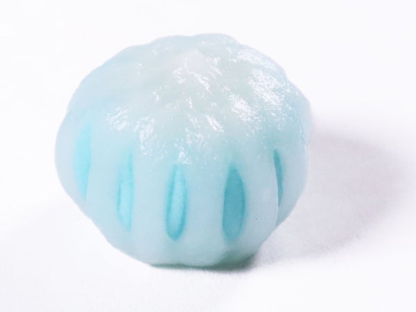 涼やかで美しいラムネ瓶やソーダを思わせる水色の小さなもち菓子です。直径約3cm。