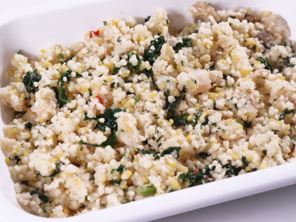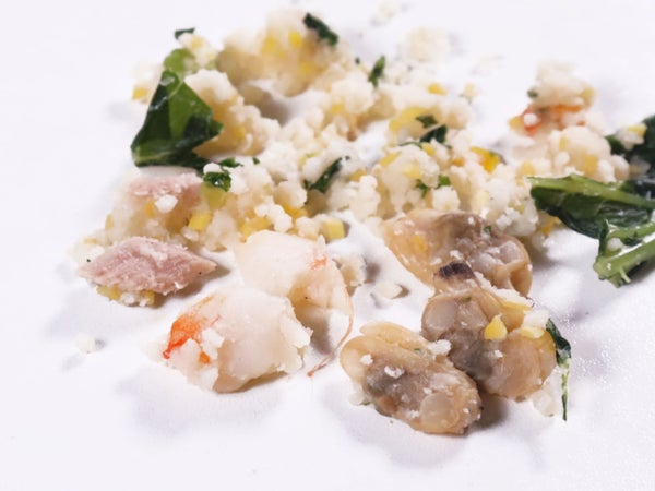 クスクス(小麦を含む、イタリア製造)、コーングリッツ、ケール、玉ねぎ、あさり、発酵調味料、砂糖、塩漬け蒸しエビ(バナメイエビ)、ぶどう酢、まぐろ油漬け(きはだまぐろ、大豆油、食塩、野菜エキス)、食用オリーブ油、赤ピーマン、黄ピーマン、食塩、あさりエキス、海老粉末、おろしにんにく/調味料(アミノ酸)、酸味料