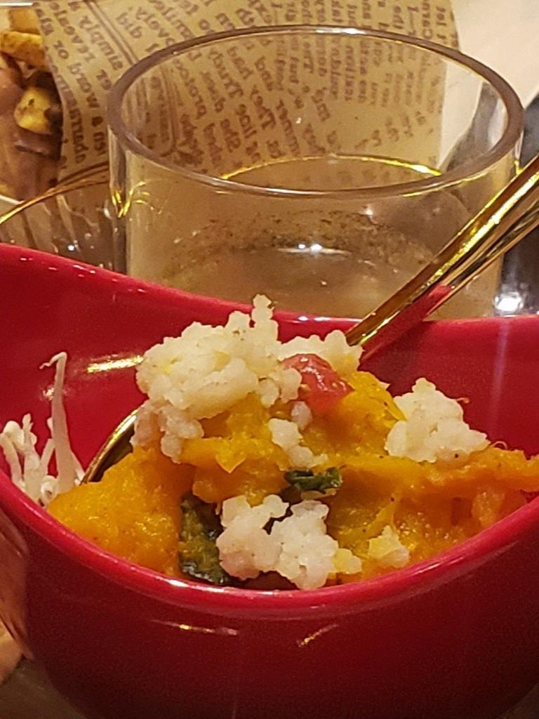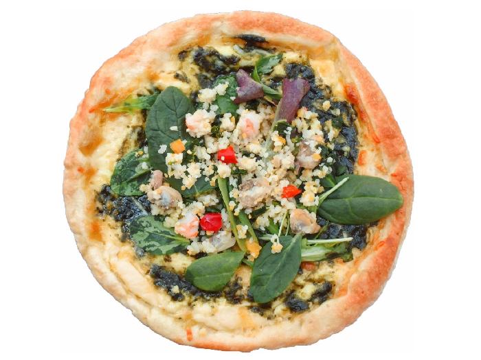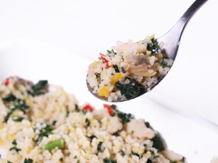 クスクス(小麦を含む、イタリア製造)、コーングリッツ、ケール、玉ねぎ、あさり、発酵調味料、砂糖、塩漬け蒸しエビ(バナメイエビ)、ぶどう酢、まぐろ油漬け(きはだまぐろ、大豆油、食塩、野菜エキス)、食用オリーブ油、赤ピーマン、黄ピーマン、食塩、あさりエキス、海老粉末、おろしにんにく/調味料(アミノ酸)、酸味料