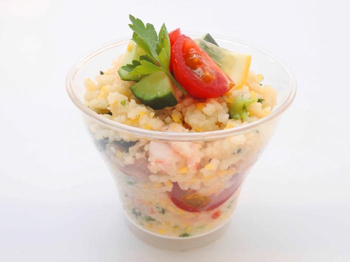 クスクスは世界最小のパスタです。クスクスにあさり・海老・ツナと彩り野菜を加え、オリーブオイル、おろしにんにくでシンプルに味付けした新感覚サラダです。肉の下に敷いたり、キャロットラぺと一緒に添えたりと幅広くお使いいただけます。冷製サラダとしても活躍します。