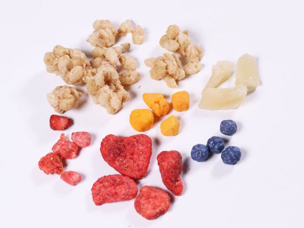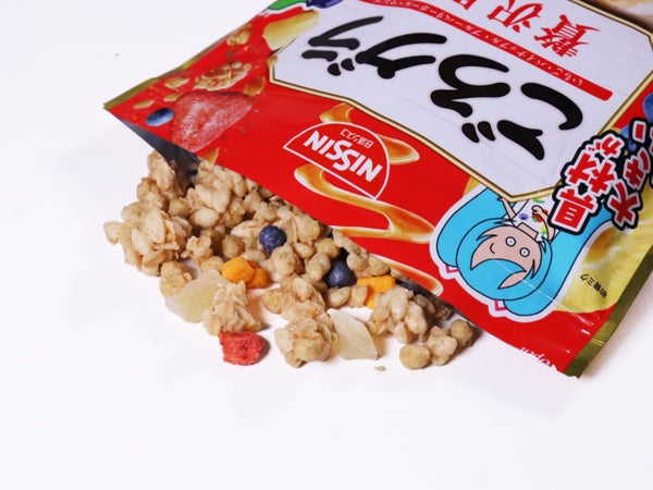 オーツ麦フレーク(オーストラリア製造又はイギリス製造又はその他)、小麦シリアルパフ(大豆を含む)、ライ麦シリアルパフ(コーングリッツ、ライ麦粉、小麦粉、その他)、砂糖、植物油脂、水溶性食物繊維、乾燥パイナップル加工品、デキストリン、乾燥いちご加工品、乾燥マンゴー加工品、ブルーベリーパフ加工品(砂糖、小麦粉、コーングリッツ、食塩、ブルーベリー果汁パウダー)、乳糖、メープルシロップ/グリセリン、炭酸カルシウム、加工でん粉、ビタミンC、乳化剤、着色料(ウコン、クチナシ、アントシアニン、パプリカ色素)、酸味料、香料、酸化防止剤(ビタミンE、ビタミンC、ローズマリー抽出物)、ピロリン酸鉄、増粘剤(アラビアガム)、カゼインNa、光沢剤、ナイアシン、パントテン酸カルシウム、ビタミンB6、ビタミンB1、ビタミンB2、葉酸、ビタミンD、ビタミンB12