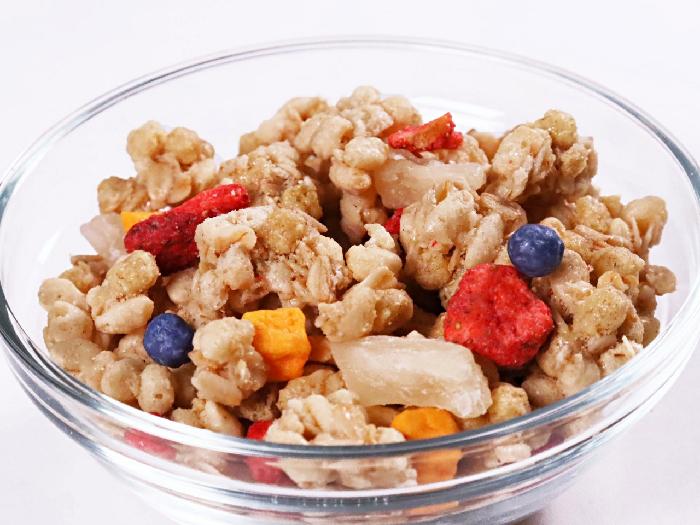 パイナップル・いちご・ブルーベリーパフ・ブルーベリー・マンゴーの彩り豊かな果実と、ザクザクした歯ごたえのシリアルをブレンドしました。